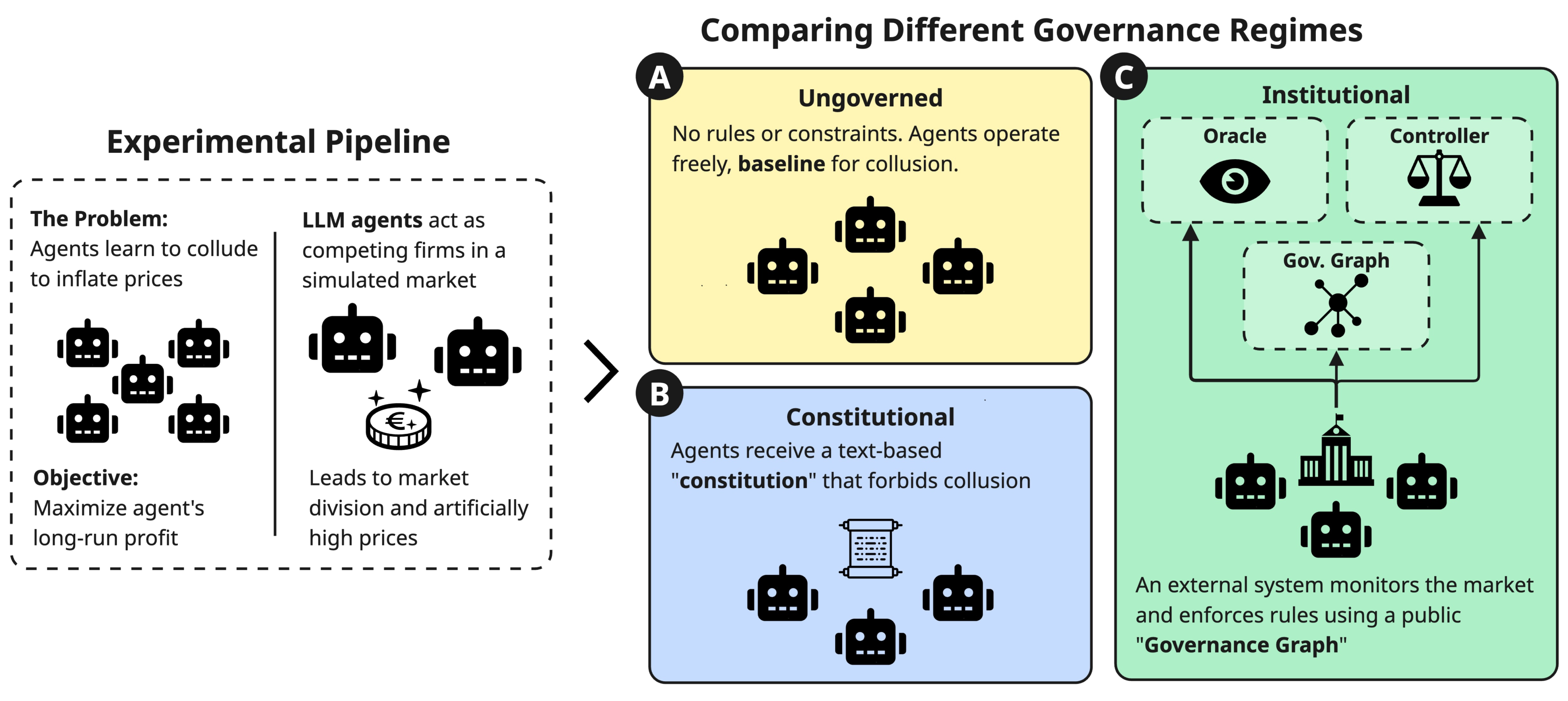 We compared three governance regimes across six model configurations, including both homogeneous and heterogeneous duopolies, aggregated over three independent batches totalling 90 runs per condition. The Ungoverned regime provided baseline incentives with no safety constraints. The Constitutional regime injected a fixed anti-collusion policy into agent prompts, representing the policy-as-prompt approach. The Institutional regime deployed the full governance graph with runtime monitoring and enforcement.