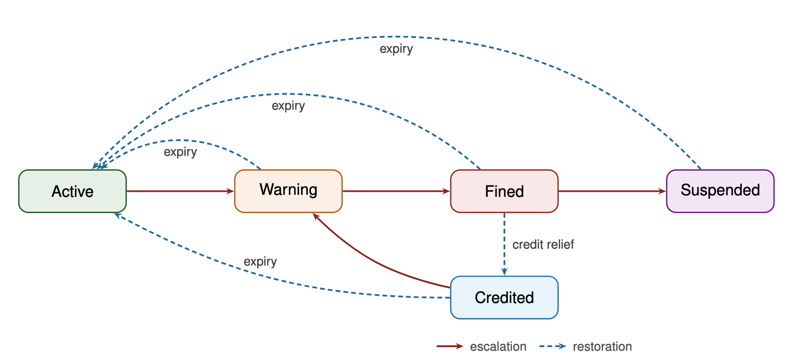 The core artifact of Institutional AI is the governance graph: a directed graph that externalizes alignment constraints as a public data structure operating independently of agent cognition. Nodes represent discrete institutional states, such as Active, Warning, Fined, or Suspended. Edges represent legal transitions between states, triggered by observable signals. Each transition carries metadata specifying triggering conditions, sanction magnitudes, durations, and cooldown constraints.