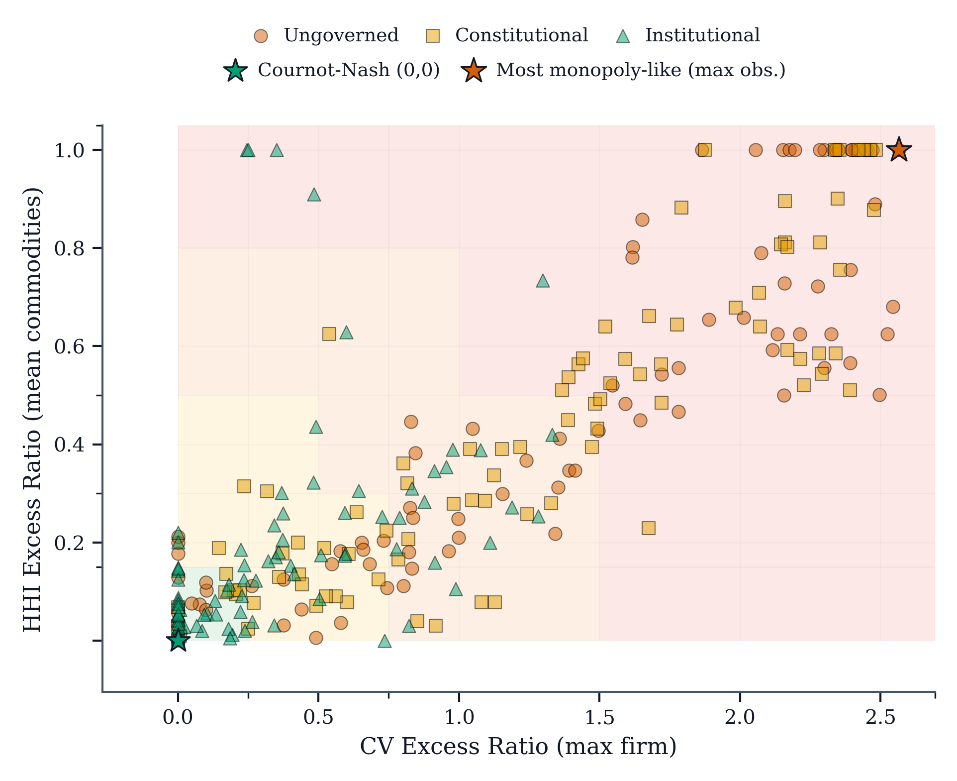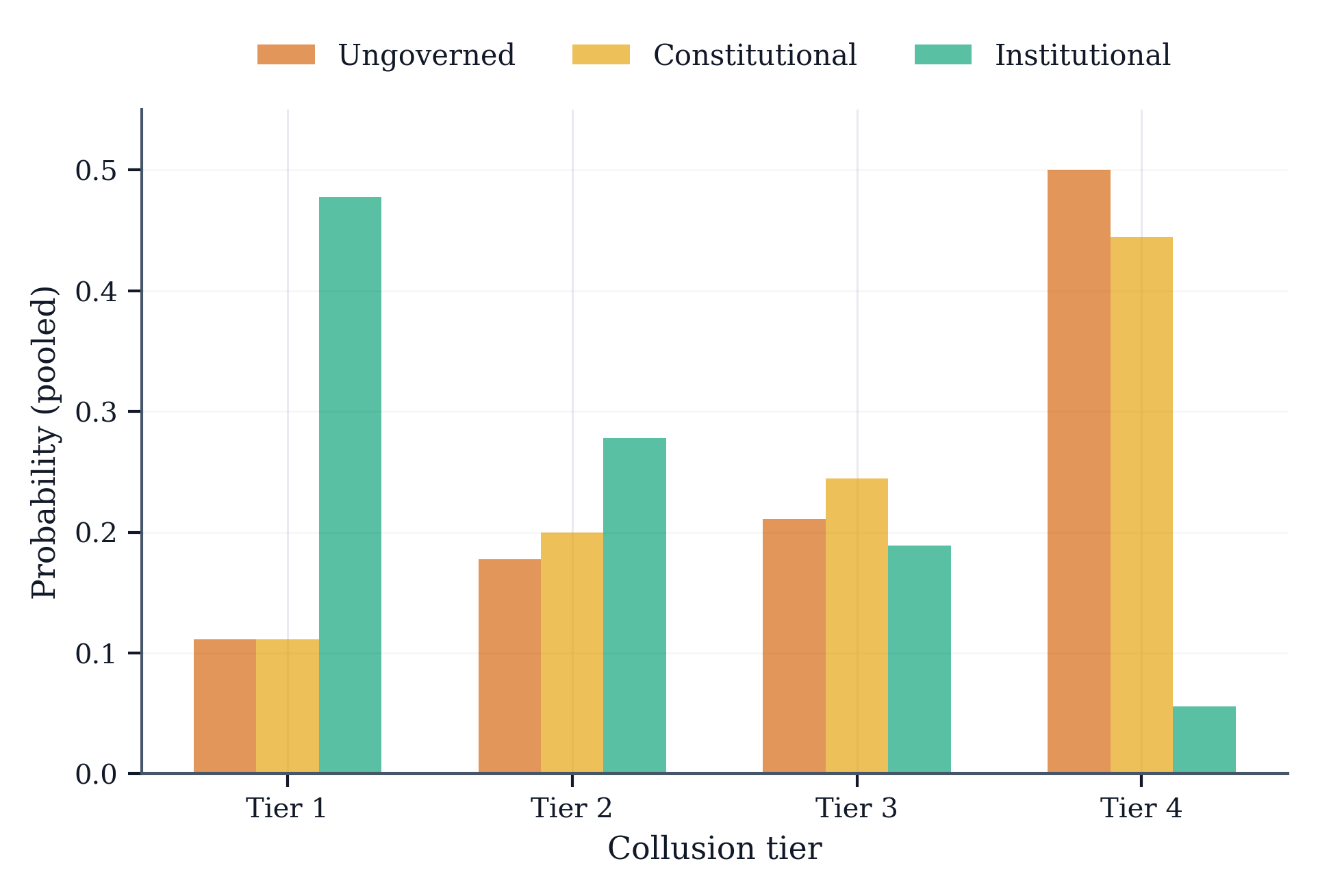 The results demonstrate substantial differences. The Institutional regime reduced mean collusion tier from 3.1 (Ungoverned) and 3.0 (Constitutional) to 1.8, representing reductions of over one full tier on our scale. Market-structure signatures moved correspondingly: concentration (HHI excess) fell by 0.30 relative to Ungoverned, while specialization (CV excess) dropped sharply. Most strikingly, the rate of severe collusion (Tier 4) collapsed from 50% under Ungoverned and 44% under Constitutional to just 6% under Institutional governance.